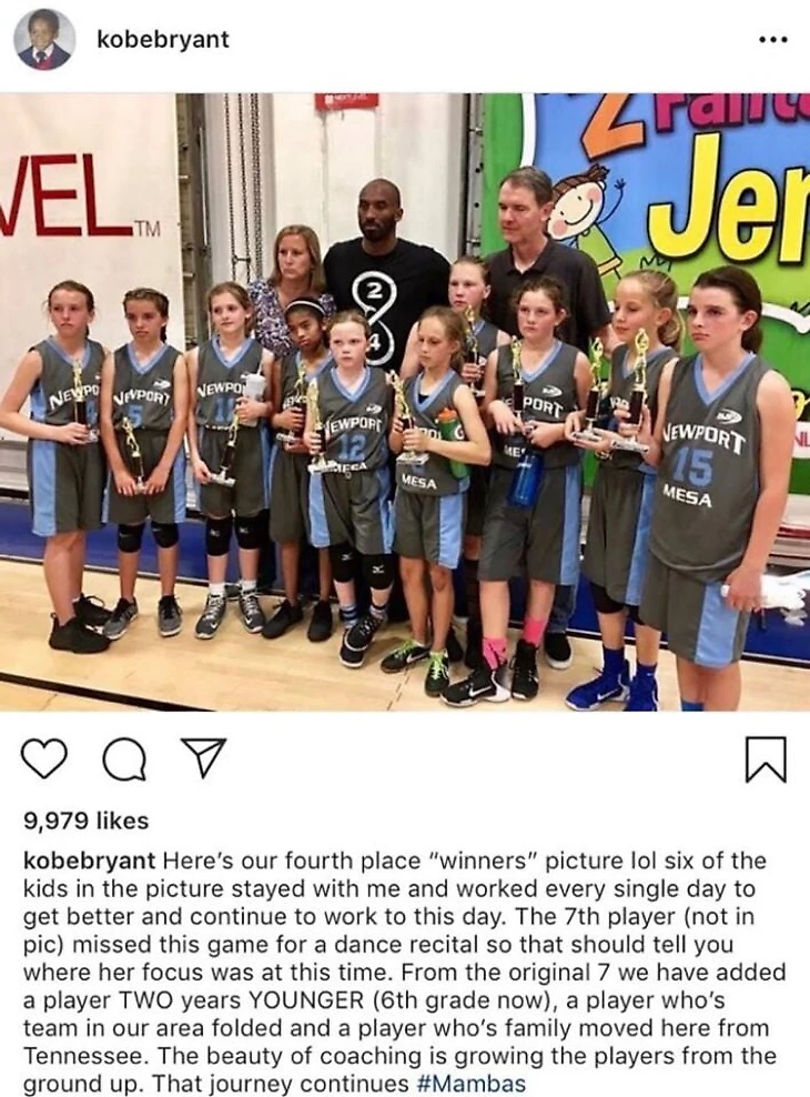 Под фотографией с грустными лицами, сделанной на том же турнире, Брайант добавил: «Шесть игроков на этой фотке остались со мной и продолжили работать каждый день, чтобы становиться лучше. Седьмая (ее здесь нет) пропустила эту игру из-за танцевального выступления – это показывает вам ее отношение на тот момент».