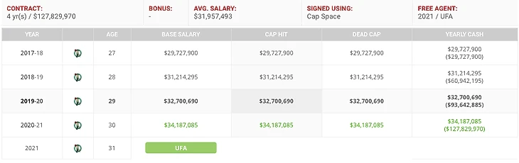 Девятый номер драфта 2010 года переходил в Бостон в 2017 как полноценный участник Олл-Стар гейма и контракт был подписан соответствующий: 128 млн на 4 года. За нынешний сезон Гордон заработал 35 млн долларов(больше чем Йокич, Яннис и Дэвис).