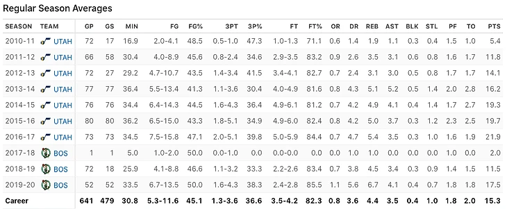 За практически 3 сезона Гордон не то чтоб превысить свой уровень игры в Юте не смог, получилось хотя бы как-то "подобраться" к нему только однажды: в нынешнем сезоне.
