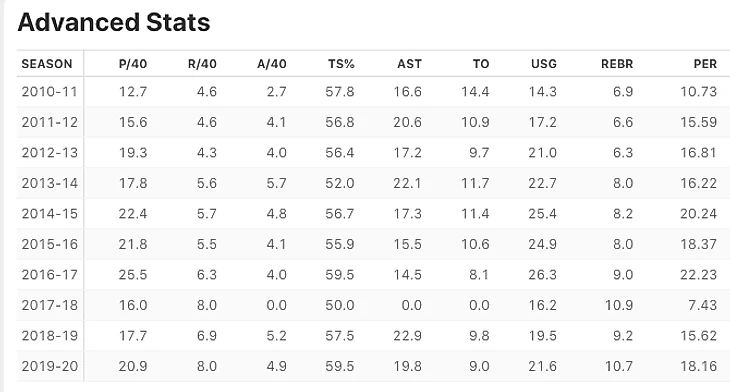 25% реализации трехочковых при 0,5 попыток за игру и 82% со штрафного--ужасный показатель для игрока, который хочет играть в команде, претендующей на проход хотя бы дальше первого раунда. Единственное что может обнадежить--очки за игру, рейтинг PER, держащийся на уровне кандидата на МВЗ и TS%.