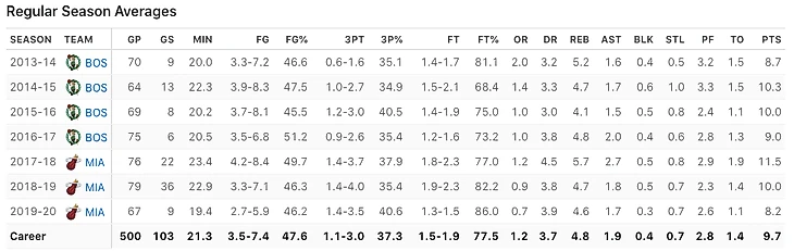 Канадец с украинскими корнями провел прошлый сезон довольно неплохо, став полноценным лидером второго юнита у новоявленных финалистов востока, хорошо заменяя Бэма Адебайо во время отдыха последнего и, благодаря прокачке навыков шутинга (40% с трехи и 86% со штрафного, по сравнению с 35 и 82 в прошлом году) стал полноценным ролевиком-универсалом, умеющим играть как на 4-ке, так и на 5-ке и бросать и растягивать оборону так, как требуется от современных "больших".