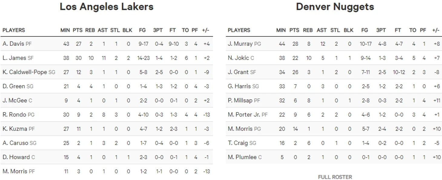 Рондо, Грин и Карузо провалили первую половину, реализовав на троих 2 броска из 14. Дэнни хотя бы отработал свои косяки в защите, а Рондо закончил половину с показателем -17, Карузо с -16. «Лейкерс» всей командой замерзли на дуге, не попав даже свободные броски. С дальней дистанции по одному забили Леброн, Кузма, Моррис, Грин и дважды Кентавиус. На 6 попаданий из 26, «Денвер» ответил 11 раз за 29 попыток. Хуже у желтых было только на старте плей-офф, в первом матче с «Портлендом» – 5 из 32.