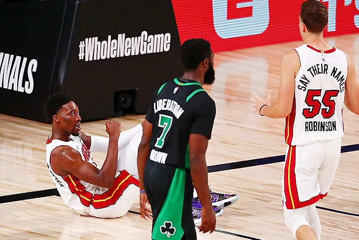 Бэм защищается на 5 позициях. Бросок через него – это -3% к попаданию, при этом -8% на дуге. Его подвижность намного ближе к защитникам, чем к большим. Например, за всю серию с «Селтикс» Тейтум сделал лишь 5 из 16 через Бэма. У «Хит» куча вариаций составов, где, несмотря на низкий средний рост, игроки могут защищаться, сменяясь почти каждый на каждого.