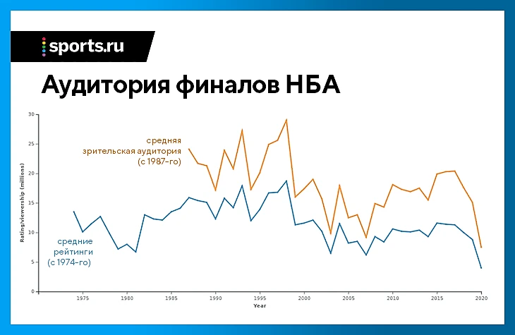 Сравнивать Джордана и Леброна в данном аспекте – это примерно как сравнивать финал-98, рекордный для истории НБА, и финал-20, худший для истории НБА в плане телерейтингов.