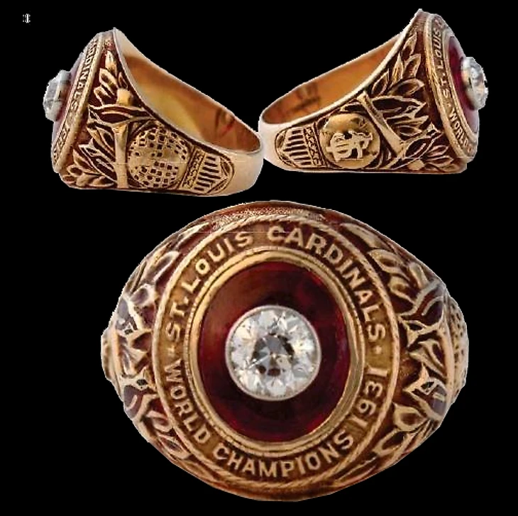 Влияние «Кардиналс» состояло и в том, что впервые на украшении появляется клубная символика. После еще одной победы в 31-м они пошли еще дальше и добавили и командные цвета: под все тем же неизменным бриллиантом в центре было сделано рубиновое поле.