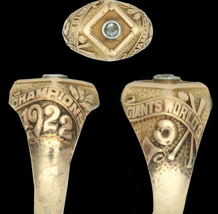 А в 1922-м «Нью-Йорк Джайнтс» стали первыми, кому достались собственно чемпионские перстни. Известно, что игроки команды сами выбрали такой трофей – в голосовании ему отдали предпочтение перед медалями и цепочками. Дизайн перстня установил многолетний стандарт: в центре располагался огромный камень, а по бокам бейсбольные биты, перчатки, название команды…