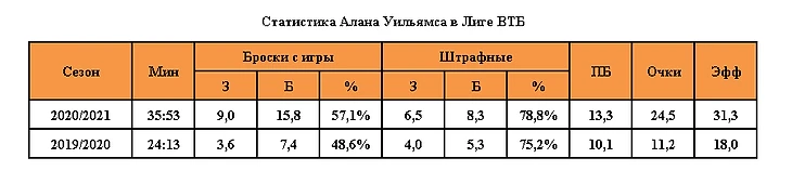 Каждый сезон Лиги ВТБ дарит нам новых героев. Одним из главных открытий на старте чемпионата-2020/21 стал Алан Уильямс. Центровой адаптировался на второй год в «Локо» и буквально взломал статистику турнира. В трех из четырех матчей он сделал дабл-даблы, а еще в одном оказался в шаге от этого достижения (не хватило одного подбора). Сейчас Уильямс с большим отрывом лидирует в Лиге в таких ключевых статистических показателях как набранные очки (24,5 очка), подборы (13,3) и эффективность (31,3). Давайте разберемся, за счет чего это стало возможным.