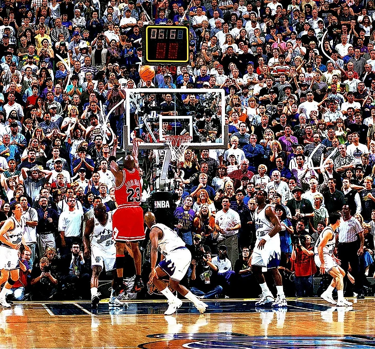 Нет более значимого события для баскетбола и для сравнения в споре величайшего чем тот бросок в Юте . Он сделан идеально . Перехват , обыгрыш с грязным приемом (будто осознав скрытую причину успеха Детройта) и бросок с любимой дистанции . Звучит как концовка фильма , и она же ей и была . Превозмогая и идя к чемпионству не только с противниками вцепившимися в ноги , но и партнерами безжизненно висящими на плечах он все же дошел . И ушел непобежденным . В этом разница и это решающий аргумент . Конечно есть ребята с бОльшим количеством чемпионств , есть те кто также не проигрывали чемпионаты . Но было ли это у них связано с таким превозмоганием ? Было ли это у них сделано так , что об этом сложат легенды ? Был ли этот игрок сам легендой ? Был ли он человеком идущим против самой системы NBA ?