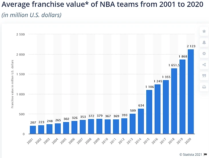 За последние 10 лет средняя оценочная стоимость франшизы НБА увеличилась в 5,75 раза. Войти в число 30 счастливчиков крайне сложно.