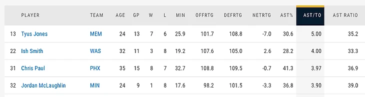 Джордан МакЛафлин полностью пропустил предсезонку и начало сезона, но он идеально вписывается в систему, о чём я не раз говорил в моих текстах. МакЛафлин слабо играл в первых матчах, принимал спорные решения с мячом в руках, не попадал открытые трёшки, но в последних матчах начал показывать качественный баскетбол. Сильное качество МакЛафлина - это умение балансировать между собственной атакой и командным нападением. Если отфильтровать игроков, отыгравших больше 8 игр, с AST RATIO (кол-во передач на 100 владений) > 30, то в рейтинге игроков с низким процентом брака при передачах МакЛафлин будет в одном списке с Крисом Полом и Таюсом Джонсом. Неплохая компания.