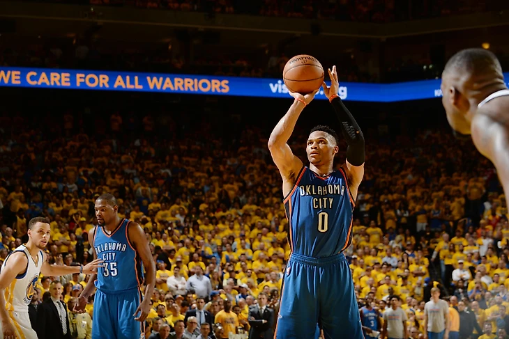 В финале Западной Конференции Голден Стэйт встретились с Оклахомой и чуть не вылетели. Кевин Дюрант (в среднем 30 очков за серию) и Рассел Уэстбрук (в среднем 26 очков за серию) разносили команду из Окленда, выиграв для Тандер 1-ю, 3-ю и 4-ю игры.