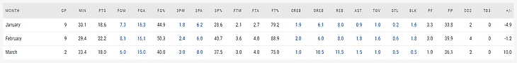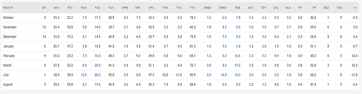 Если говорить отдельно о Кристапсе, то многие считают проблемой то, что он не так продуктивен, как был в конце прошлого сезона. Лично я, пока, не считаю это большой проблемой. Дело в том, что в прошлом году было ровно то же самое. Он входил в сезон после травмы, привыкал к себе несколько месяцев, а потом его прорвало. Смотрите сами. Вот статистика КП в прошлом сезоне по месяцам: