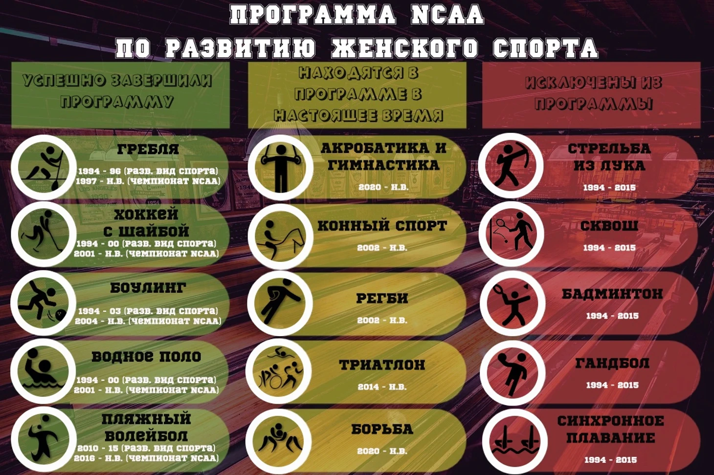 Видов спорта вообще без стипендий – нет, а виды спорта, которым занимается только один пол (м/ж) – есть. Женские команды в принципе не предполагаются только в трёх видах: бейсбол, футбол, борьба. В то же время мужчин нет в: хоккее на траве, триатлоне, гребле, регби, конном спорте, пляжном волейболе, софтболе и боулинге. Для женщин вообще созданы все условия: один только конный спорт, которого нет у мужчин, предполагает целых 15 полных стипендий. С чем связана такая чрезмерная толерантность, речь пойдет ближе к концу.