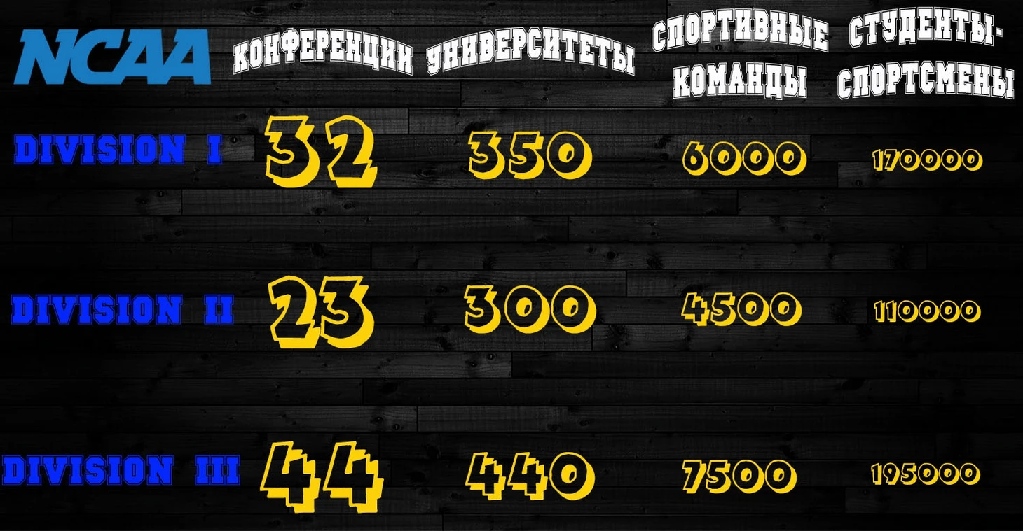 Самые богатые универы выступают здесь. Все студенты-спортсмены получают специальные стипендии, даже если отбывают в команде номер. Ежегодно сотни молодых людей и девушек становятся профессионалами (если учитывать все охваченные виды спорта).