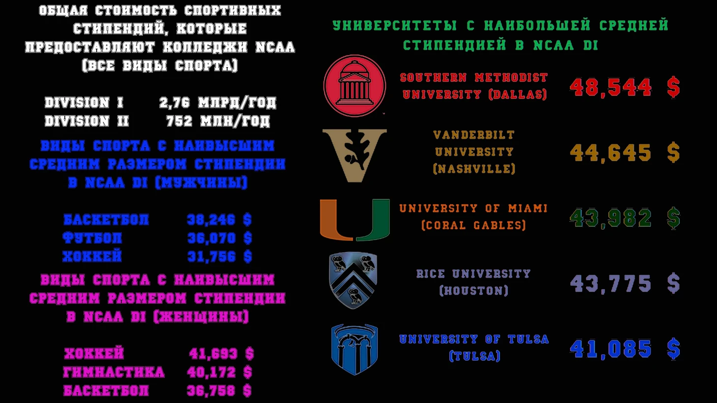 При этом стоит отметить, что каждый спонсируемый вид спорта имеет лимит не только по количеству стипендий, но и по размеру таких компенсаций. Сделано это в первую очередь для того, чтобы университет не разорился на бесперспективных студентах и при этом мог платить максимум своим лучшим игрокам.