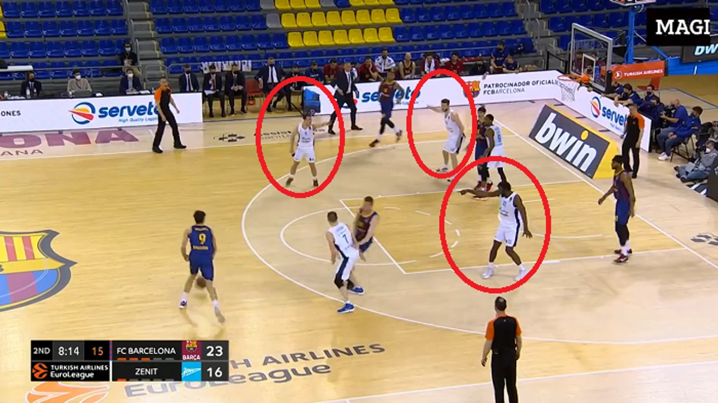 В этот же раз испанцы с первых же минут включились в защите. Подвижный состав с помощью давления и разменов с ходу вынудил «Зенит» играть в нелюбимый питерцами «героический» баскетбол. Гостям приходилось большинство бросков совершать с активным сопротивлением, что резко снижало эффективность их атак.