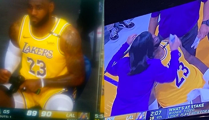 Скованность голеностопа Леброну приходилось компенсировать работой других мышц, которые он в каждом перерыве усиленно грел каким-то продвинутым чудо-массажером из «магазина на диване». В концовке игры в столкновении с Дрэймондом Грином (кем же еще?) Джеймс еще и получил пальцем в глаз – пришлось спешно промывать перед тем, как бросать штрафные.