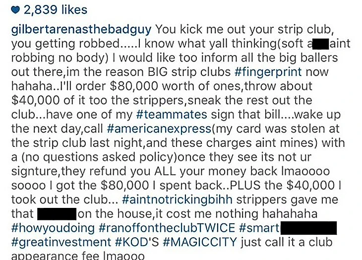 Если Родман был в образе гангстера, то Гилберт Аренас им на самом деле был. Помимо историй с ружьем в раздевалке, с угрозами одноклубниками и другими моментами, которые заставляли всех браться за голову, в биографии Аренаса затесался момент, связанный со стрип-клубом.