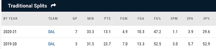 Мы видим положительную тенденцию увеличения количества бросков, очень приличную реализацию (на самый всякий случай – столбец 3P%), но это, будь она не ладна, регулярка. В плей-офф латыш дебютировал в «пузыре» и имеет следующие показатели:
