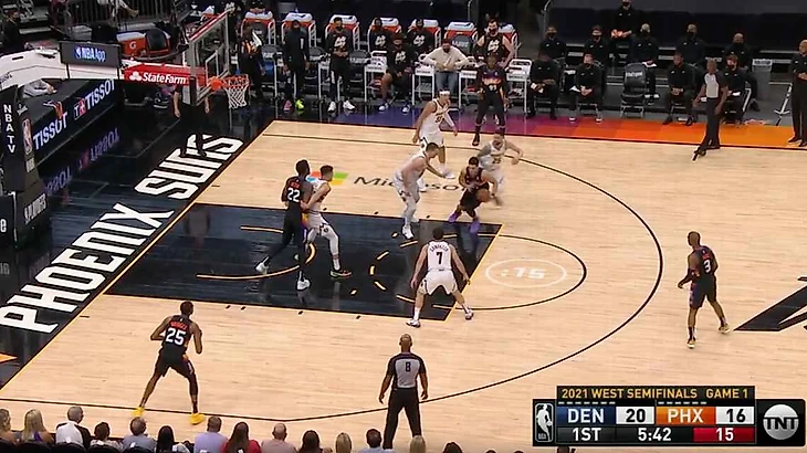В видео под названием 2Q Game 1 Suns Nuggets Bridges 3 on triangle action, мы видим, как Кампацо теряет Пола на его первом шаге, как на Пола вытягивается Йокич, бросая Эйтона, которого пытаются закрыть 4 и 11 номер Денвера. В результате Пол имел несколько вариантов развития атаки. Пас на ушедшего под кольцо Эйтона, пас на вершину дуги и та передача, которой он закончил. При этом пас у Пола был технически сложным, через всю площадку, через двух блокирующих, можно сказать и повезло.