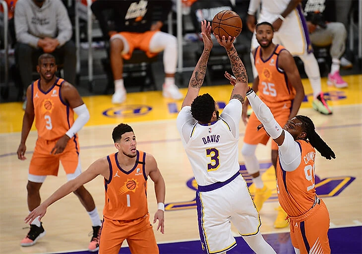 «Финикс» среди всех оставшихся команд обладает, пожалуй, самым подвижным центровым на дуге. Это важно, «Клипперс» любят играть маленькой пятеркой, они уничтожили так Гобера и Бобана с Порзингисом, Деандре может подниматься наверх и даже периодически размениваться на маленьких соперников. Он провел большую часть времени защиты против Йокича на дуге, бегал за ним через заслоны малышей и страховал на пик-н-роллах своих партнеров. Дополнительный плюс открылся в плей-офф: проводя на 5 минут больше за матч чем в регулярном чемпионате, Деандре стал совершать на 0,2 фола меньше. Он очень аккуратный защитник, который не прыгает в попытках совершить блок, а предпочитает поставить соперника в неудобное положение и закрыть тому обзор для броска. Даже 32+20+10 от серба выглядит страшным только на бумаге, а на деле Йокичу пришлось сделать треть всех бросков с процентом 44,8%, что на 12% ниже его статистики по регулярному сезону.
