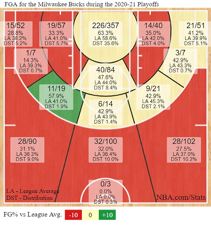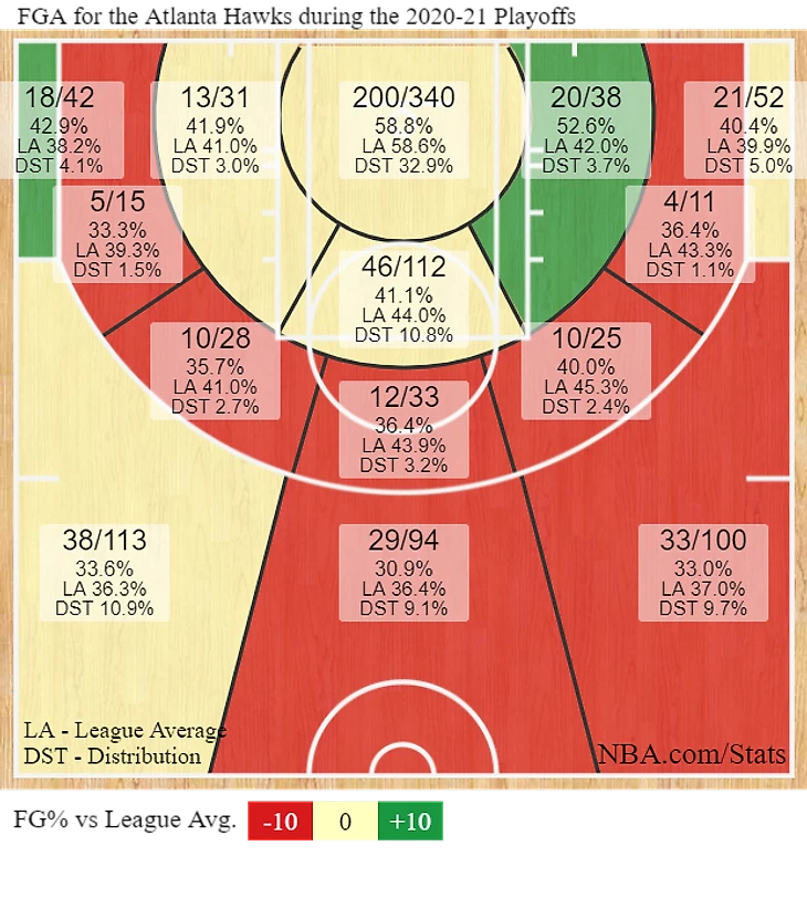 По данным Second Spectrum, за последние 3 сезона только 2 команды НБА выполнили больше бросков из этой зоны, чем «Милуоки Бакс». За это же время всего 5 игроков сделал больше бросков из этого региона, чем разыгрывающий «Атланта Хокс» Трэй Янг. В течение первых двух раундов плей-офф ни один игрок не сделал больше бросков, чем Янг (97). Однако следующим за ним по количеству попыток заработать 2 очка из этой зоны является звезда «Милуоки Бакс» Яннис Антетокунмпо (87). То, как защита «Милуоки» и «Атланты» справится с Янгом и Антетокунмпо, соответственно, в тыловой части краски, будет важным фактором при определении того, какая из их команд перейдет в Финал НБА, чтобы представлять Восток.