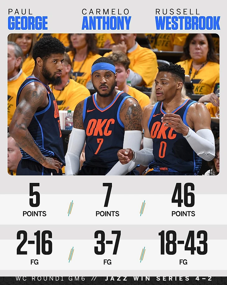 - Второй матч Джордж провалил, выбросив 6/21. В той игре у «Тандер» не полетело ни у кого. В последнем отрезке игры произошла чуть ли не катастрофа: Энтони завершил четверть с результатом 0 из 4, Джордж – 0 из 6, а Уэстбрук – 0 из 4.