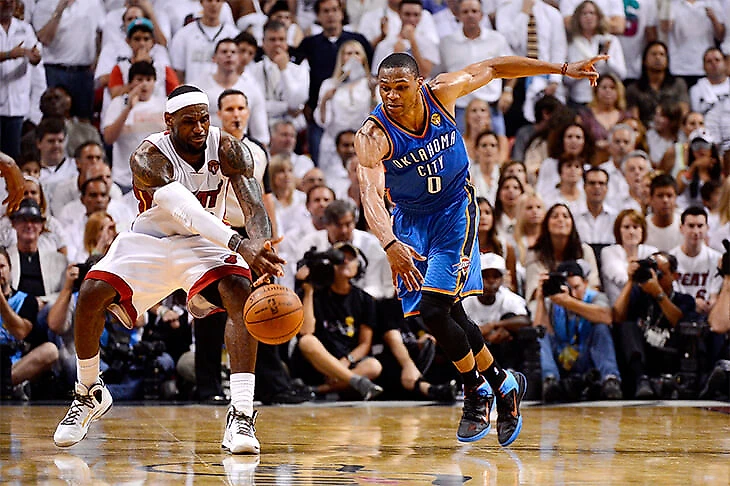 Решающей стала пятая игра противостояния. Джеймс и компания быстро завладели инициативой: управляли темпом и быстро гасили рывки «Тандер», удерживая дистанцию в районе 10 очков. Уэстбрук не мог смириться с таким положением дел. В предыдущем матче он набрал 43 очка (20 из 32 с игры) и намеревался собственными силами удержать команду на плаву. Но не получилось.