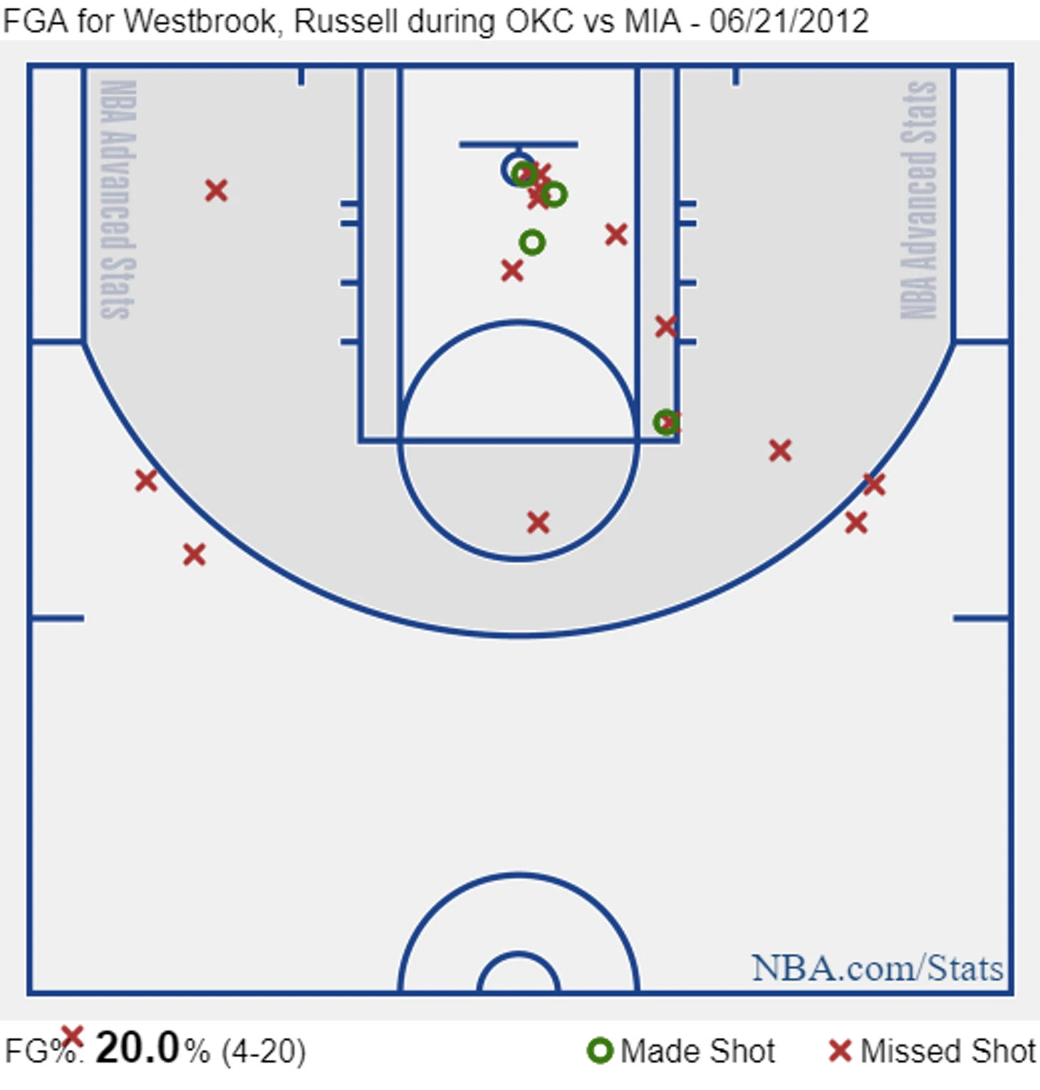 За 48 минут Расселл смог реализовать лишь 4 из 20 попыток. Первый номер «Оклахомы» неточно заряжал издали, пытался бросать средние и залезал под защиту Уэйда.