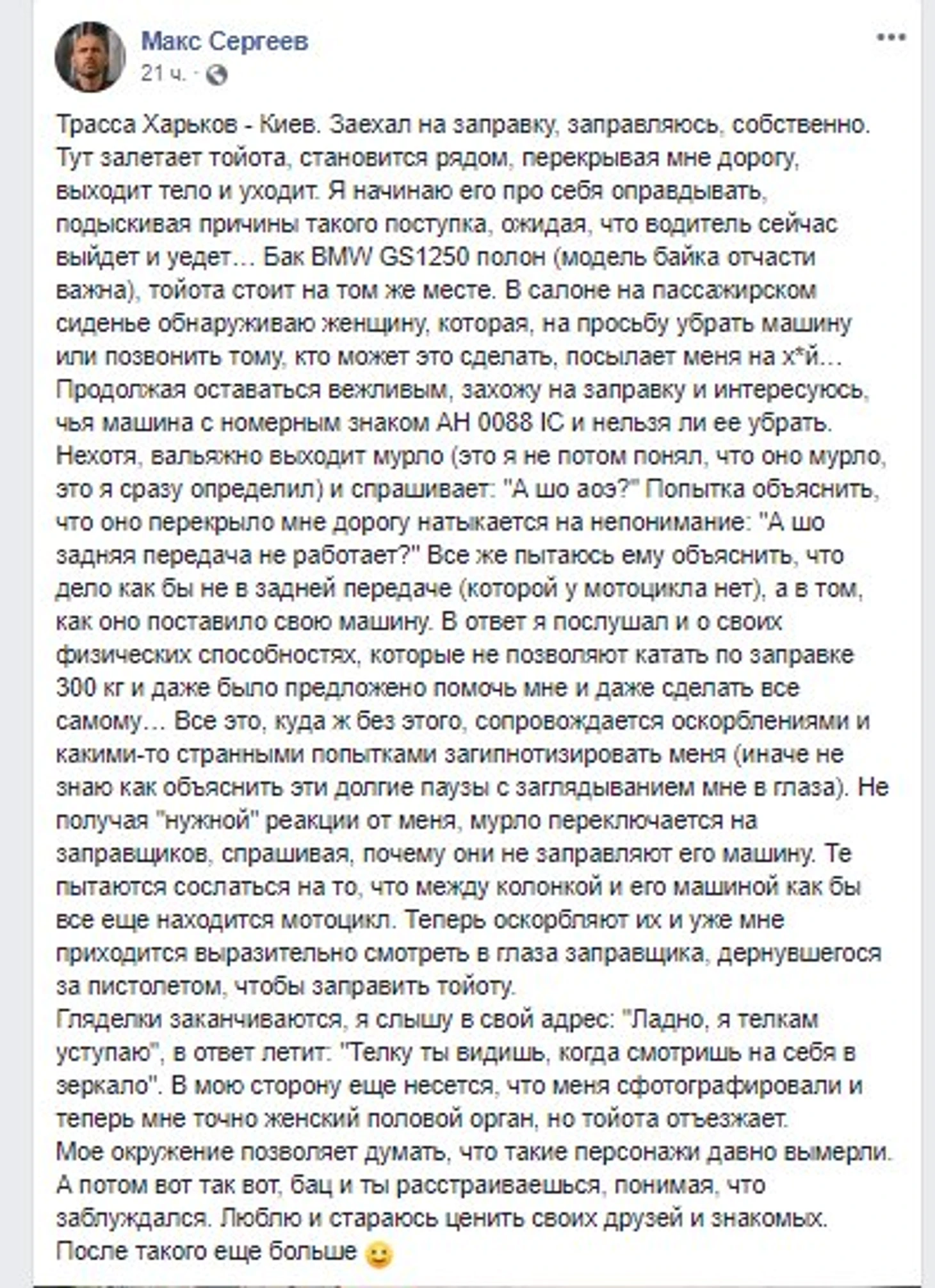 Забавный случай произошёл летом с байкером Сергеевым на трассе Харьков — Киев при заправке своего BMW GS1250 (модель байка отчасти важна). И, как рассказал прессе во всём идеальный байкер, его послали: “Иди нах*й”.