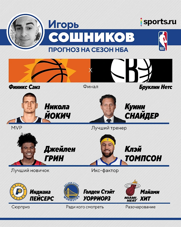 Лучший новичок: Я верую в Джейлена Грина. Мне он как-то сразу понравился, когда я начал смотреть его игры за «Игнайт». Думаю, что у Грина такое сочетание скорости, роста и броска, которое идеально подходит для уничтожения НБА. В «Рокетс» ему дадут огромную роль и кучу владений, так что статистика уже в первом сезоне может быть очень крутая.