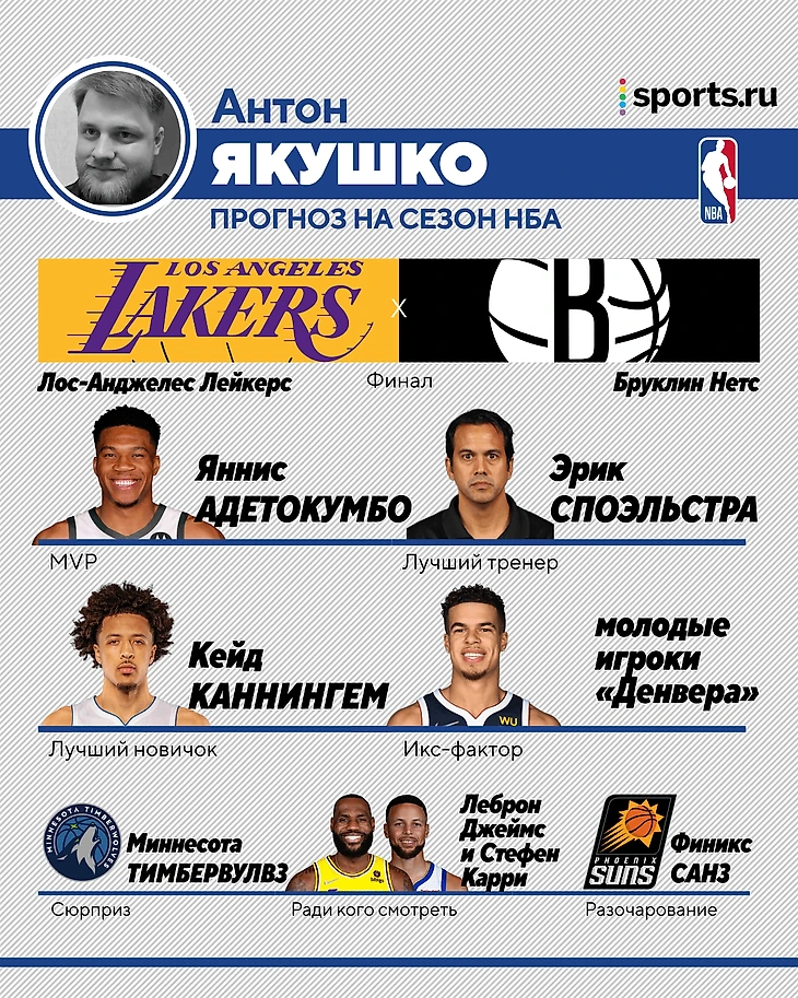 Сюрприз и разочарование: Есть ощущение, что в какой-то из этих категорий окажутся «Лейкерс». У них настолько специфический ростер, что мы либо увидим от них что-то героическое, либо напишем и прочитаем примерно миллиард колонок про стремительный закат империи Лерона. Не вижу вариантов, при которых они, например, просто дежурно проигрывают в финале. Не жду вообще ничего хорошего от «Далласа». То есть Дончич, разумеется, будет сверкать, но вообще не понимаю, почему вдруг Кидд должен выступить как-то драматически лучше Карлайла примерно с тем же составом.