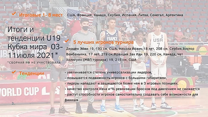 В конце августа проводился анализ летних выступлений мужских резервных сборных U20, U18 и U16. На контрасте с командами-лидерами этих турниров, а также кубка мира U19. Позволю себе разместить страницу из той презентации. В ней компактно описаны итоги и тенденции, проявленные кубком мира U19.