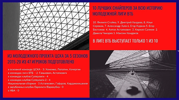В начале лета мы рассматривали пути перезагрузки молодежного проекта ЦСКА. Посмотрите одну из страниц этой презентации. Из десяти лучших за всю историю молодежной лиги ВТБ по набору очков игроков во взрослой лиге ВТБ сейчас играет только один. Много забивать, подбирать и иметь высокие коэффициенты эффективности в молодежке не означает получить пропуска в мужской баскетбол высокого уровня.
