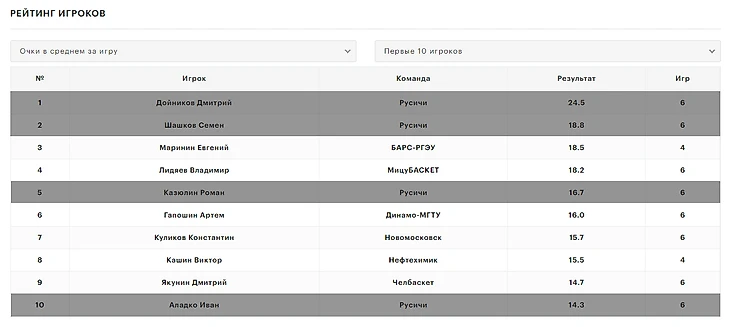 Но главной ударной силой «Русичей» является Дойников Дмитрий. Тяжелый форвард возглавляет рейтинг лучших снайперов сезона (24.5 очков) и занимает второе место в дивизионе по среднему количеству подборов (8.8). Дмитрий уже дважды набирал 31 очко за игру, что является лучшим индивидуальным показателем на данный момент.