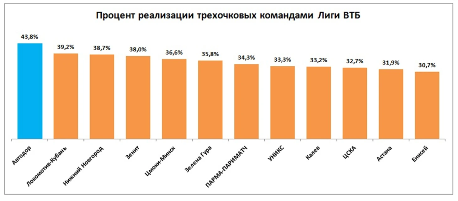 Главной же фишкой атакующей игры «Автодора» являются трехочковые. Волжане сейчас являются лидерами турнирами как по количеству точных бросков из-за дуги, так и по проценту их реализации.
