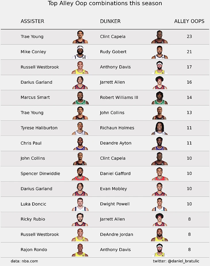 В этом сезоне Расселл играет «всего» 7,5 пик-н-роллов за игру, находясь на 21-м месте среди всех игроков лиги. Есть несколько причин, из-за которых ему пришлось изменить свою игру. Во-первых, тренерский штаб пытаются построить командное нападении менее зависимое от пик-н-ролла, так как данный вид розыгрыша активно задействует только двух игроков и поэтому соперник может «разобрать» его и найти способ остановить. Во-вторых, Таунс не является рим-раннером в чистом виде. Ниже статистика по лучшим в лиге дуэтам по исполнению аллей-упов. Мы видим, что в этом списке большинство это либо атлетичные игроки типа Коллинза, Уильямса, либо мобильные большие с очень длинными руками как Гобер, Мобли. Либо и то и другое как Дэвис. Таунс на их фоне не выглядит суператлетом, но у него другие сильные стороны, собственно по той же причине в этом списке нет Йокича, Эмбиида и Янниса. Будет интересно посмотреть игры Миннесоты на этой неделе, так как из этого списка мы будем играть с тремя командами с элитными рим-раннерами (Атланта, Юта и Кливленд)