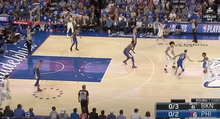 На картинке ниже типичная для Бруклина расстановка в нападении: Расселл и Аллен играют «spread pick&roll», защита максимально растянута, на краях играет Джо Харрис, который в том году победил в конкурсе трехочковых бросков. У Расселла нет быстрого первого шага, поэтому Джаррет Аллен идеально дополнял его в роли рим-раннера, постоянно угрожая кольцу и заставляя защиту раскрываться.