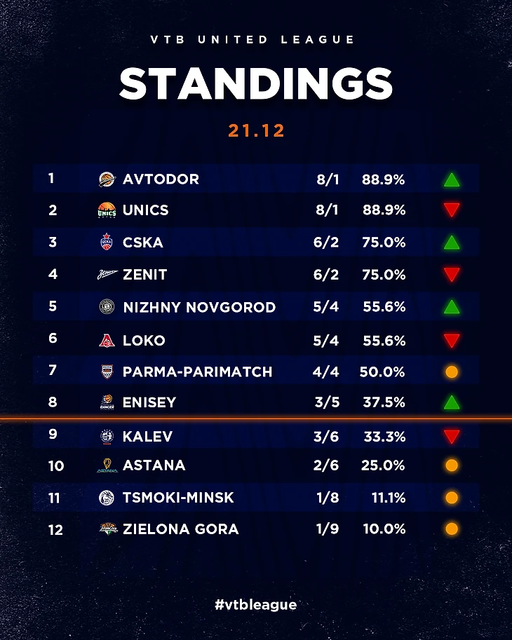 Красноярская команда порадовала своих болельщиков первой домашней победой, одолев на родной «Арене Север» «Цмоки-Минск». После этого подопечные Дражена Анзуловича поднялись на 8-ю строчку, выбив из зоны плей-офф «Калев».