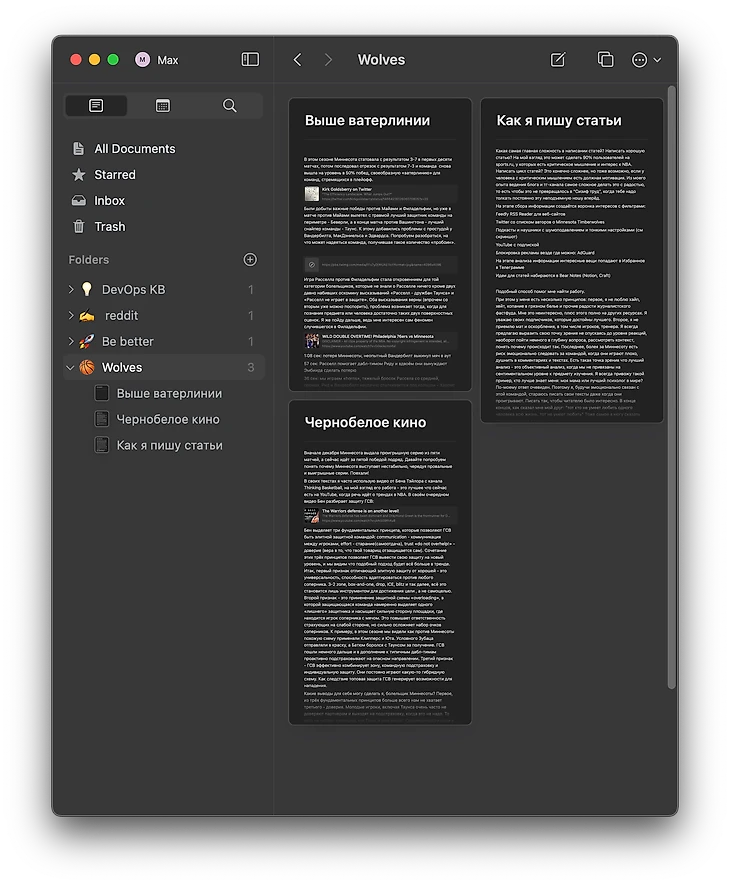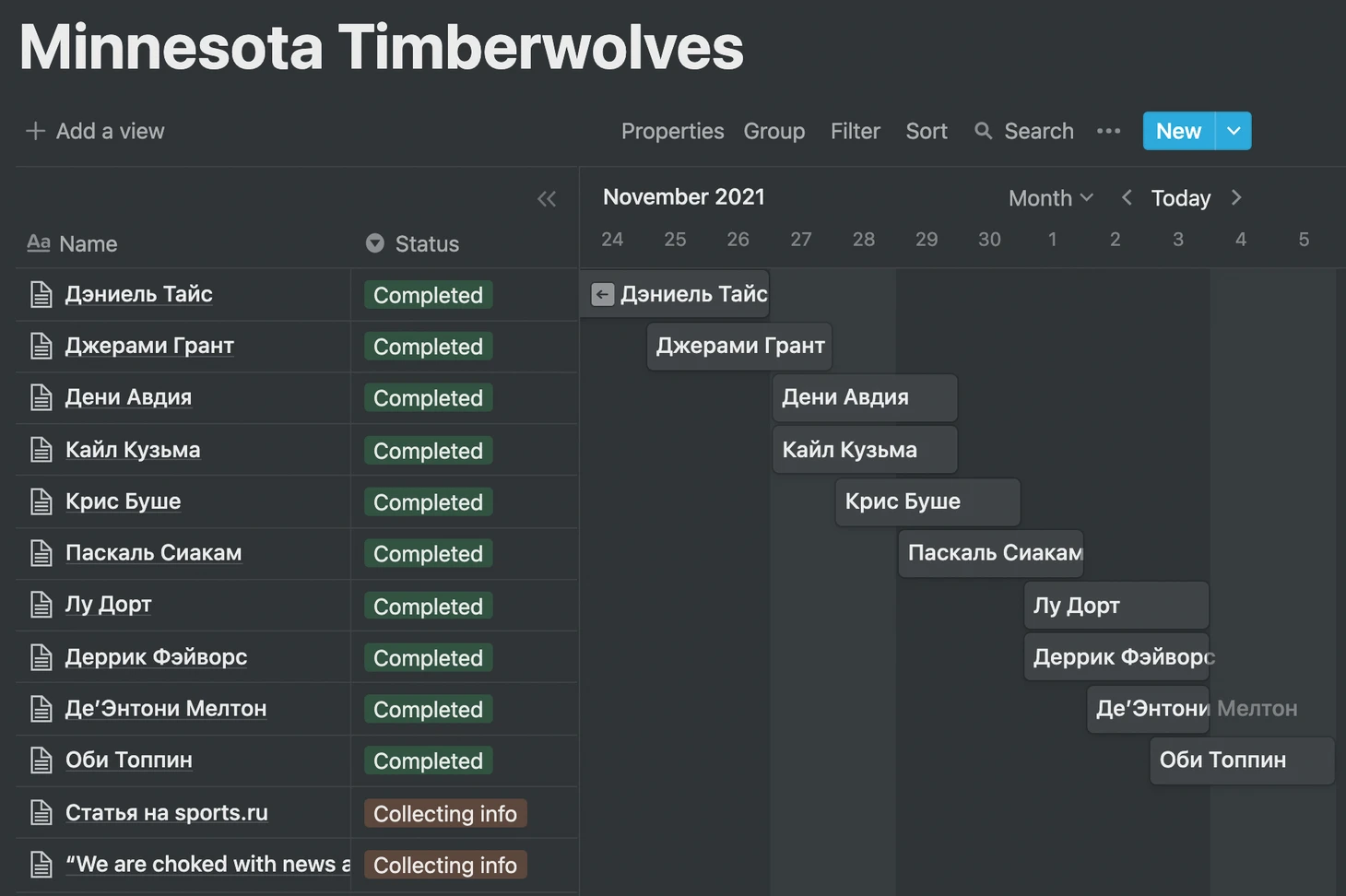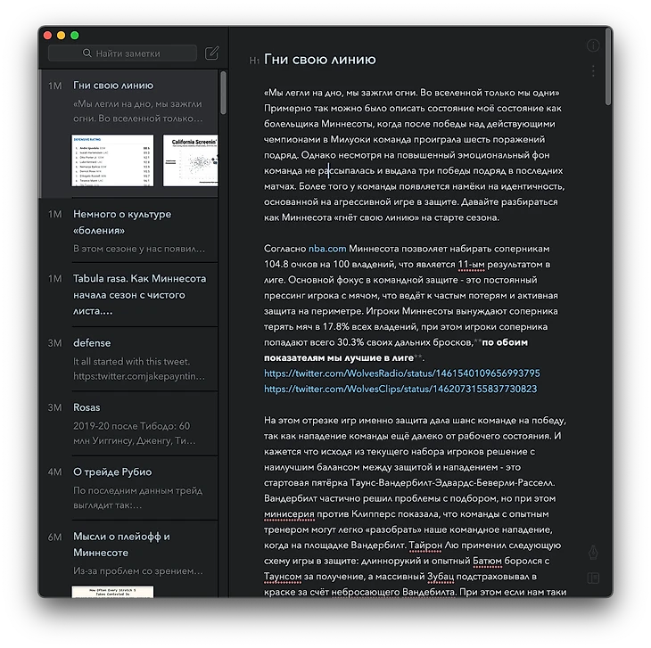 Мне нравится минимализм этого приложения, проблема в том, что во-первых, данный заметочник есть только на iOS/MacOS, во-вторых, у него нет предпросмотра Twitter-ссылок. Поэтому в прошлом месяце как альтернативу я использовал всем известный Notion. Вот так к примеру выглядит мой цикл отчётов по игрокам, которые могли бы усилить Миннесоту в результате обменов.
