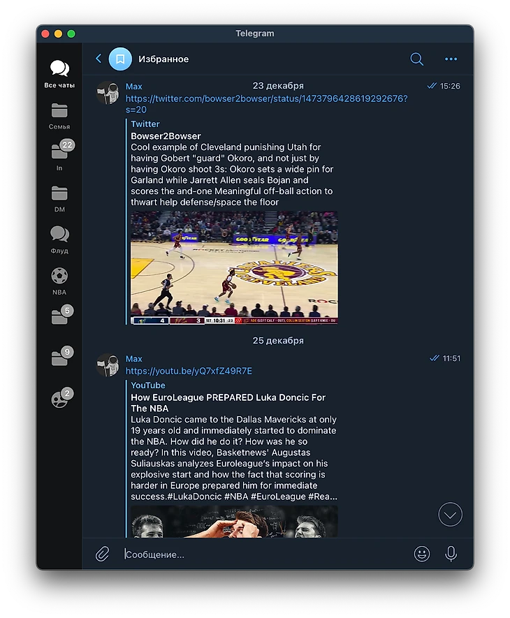 В Telegram я создал папку NBA, в которую закинул интересные мне тг-каналы про баскетбол.