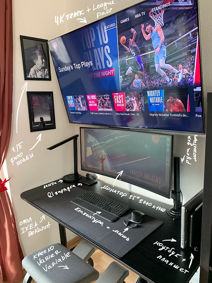 Бонус: выкладываю фото своего домашнего-рабочего места во время пандемии. Отдельной комнаты у меня нет, поэтому пришлось делать вертикальный сетап в зале. Днём тут рабочая зона, вечером центр развлечений для детей, а совсем поздним вечером пишутся тексты про Миннесоту.