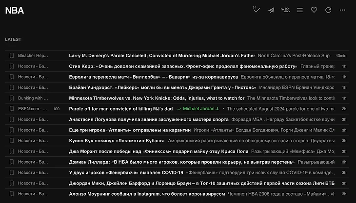 Чтобы понять как я собираю информацию, представьте себе воронку, в которую попадает вся информация о NBA и в частности о Миннесоте. Проблема в том, что сейчас информации слишком много и ещё нужно обязательно фильтровать. Например для чтения новостей я использую RSS-ридер Feedly, вот так выглядит список новостей про баскетбол: