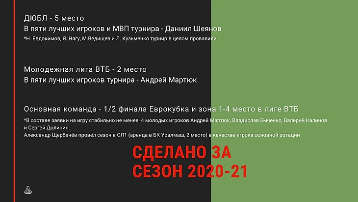 Задачи реализации стратегии в горизонте 3-5 лет звучали как: постоянное пополнение основной команды/иметь представительство на драфте НБА/входить в топ-8 рейтинга eurohopes/организовать «профессиональный лифт» для тренеров/присутствовать минимум 2 игроками в топ-5 лучших игроков всех финалов первенства России.