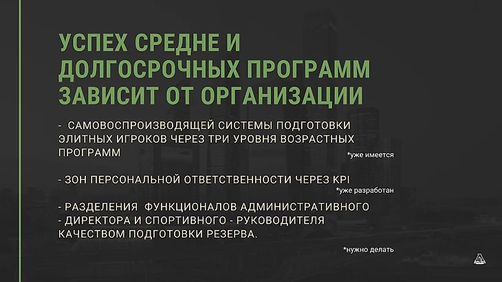 Технологии подготовки стали доступны, кадры с высоким потенциалом (как игроки, так и тренеры) подросли. Требуется изменить природу целеполагания и перейти к длинному горизонту планирования развития профессиональных клубов. Прежде руководство клубов видело основу своего выживания в занятом по итогу одного «здесь и сейчас» текущего сезона места. Некоторые клубы уже переросли такой короткий период планирования. И это хороший признак.
