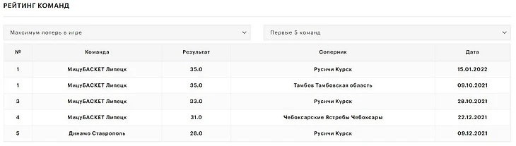 Самое слабое место липецкой команды – огромное количество ошибок. «МицуБАСКЕТ» имеет самый плохой показатель по потерям в среднем (23). А вот так выглядят топ-5 результатов по максимальному количеству потерь в одной игре.
