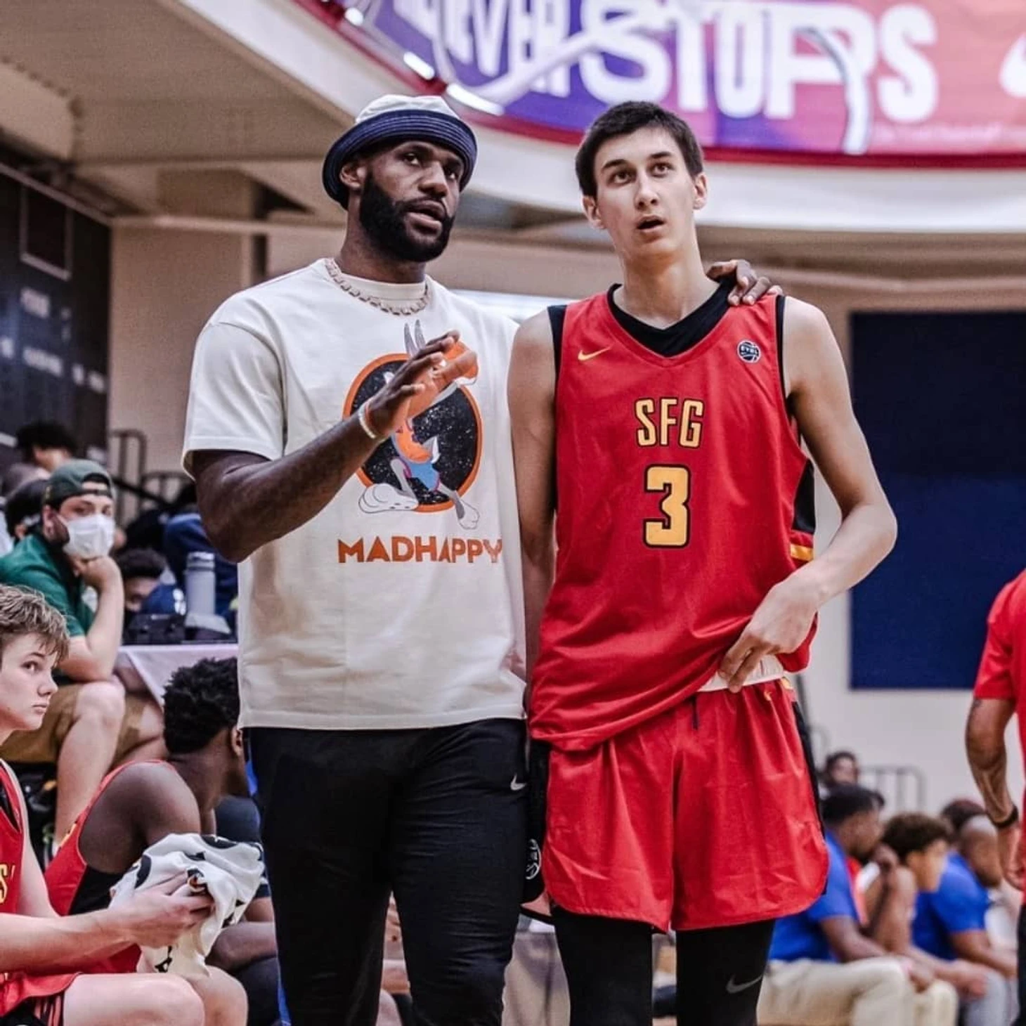 На матчи Sierra Canyon приходит и сам Леброн Джеймс. Если в сезоне он занят своими делами с «Лейкерс» и в принципе, даже когда приходит, соблюдает все правила, то в летних матчах может спокойно присесть на скамейку команды и начать давать советы — то главному тренеру, то… самому Тимофею.
