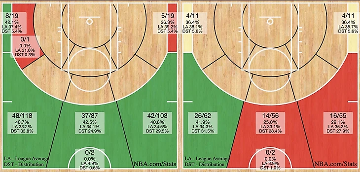 Карри в январе выдал 32,9% из-за дуги и 38,5% с игры, и вообще долгое время после взятия рекорда Аллена по количеству 3-ех очковых был сам не свой. Так к концу предыдущего месяца выглядела его выборка по броскам до (слева) и после рекорда.