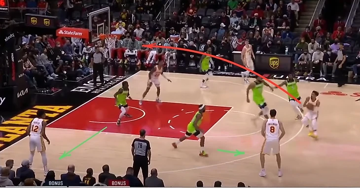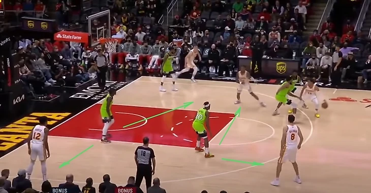 Последний фактор – это наша защитная схема «high wall – low man», если Таунс и стоппер (чаще всего это Беверли) не могут сдержать разыгрывающего соперника и тот отдает обостряющий пас, то трое игроков Миннесоты остаются против четырех игроков соперника, далее на подстраховке мы играем агрессивный «x-out». При этом данная защитная схема не является «серебряной пулей» против любого нападения (как и любая другая), ниже пример как легко Трэй Янг разбирался с нашей подстраховкой играя «spread pick-n-roll». Янг показал взглядом что отдаст мяч в угол, выключив таким образом Эдвардса, при этом Окоги не мог оставить Галлинари одного под 45 на дуге, в результате Янг выполнил точный наброс на Коллинза, который легко перепрыгнул опоздавшего Эдвардса. Легкие два очка для Атланты.