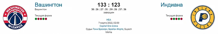 «Вашингтон Уизардс» (29-34) занимает 11-е место в турнирной таблице Восточной конференции НБА, а «Индиана Пэйсерс» (22-44) идёт 13-й.